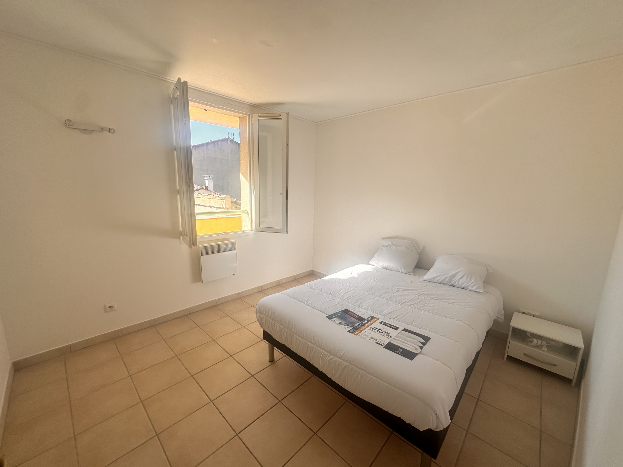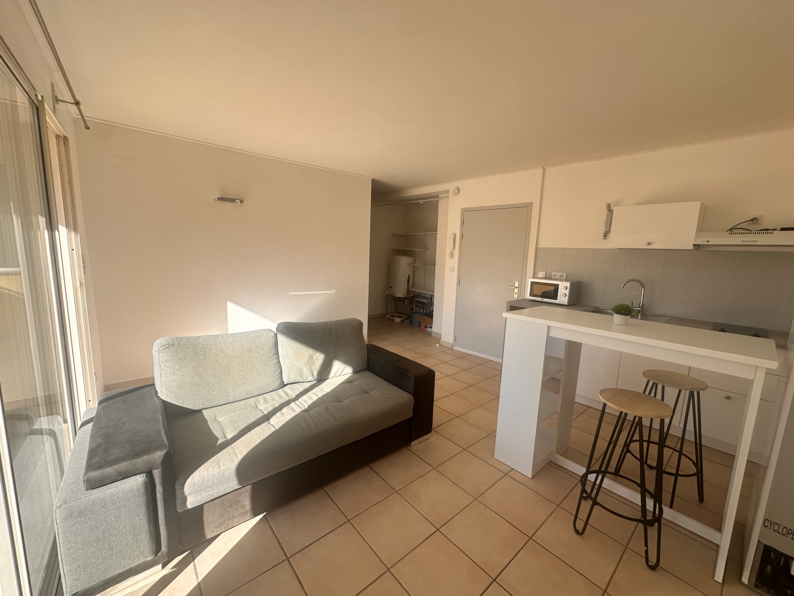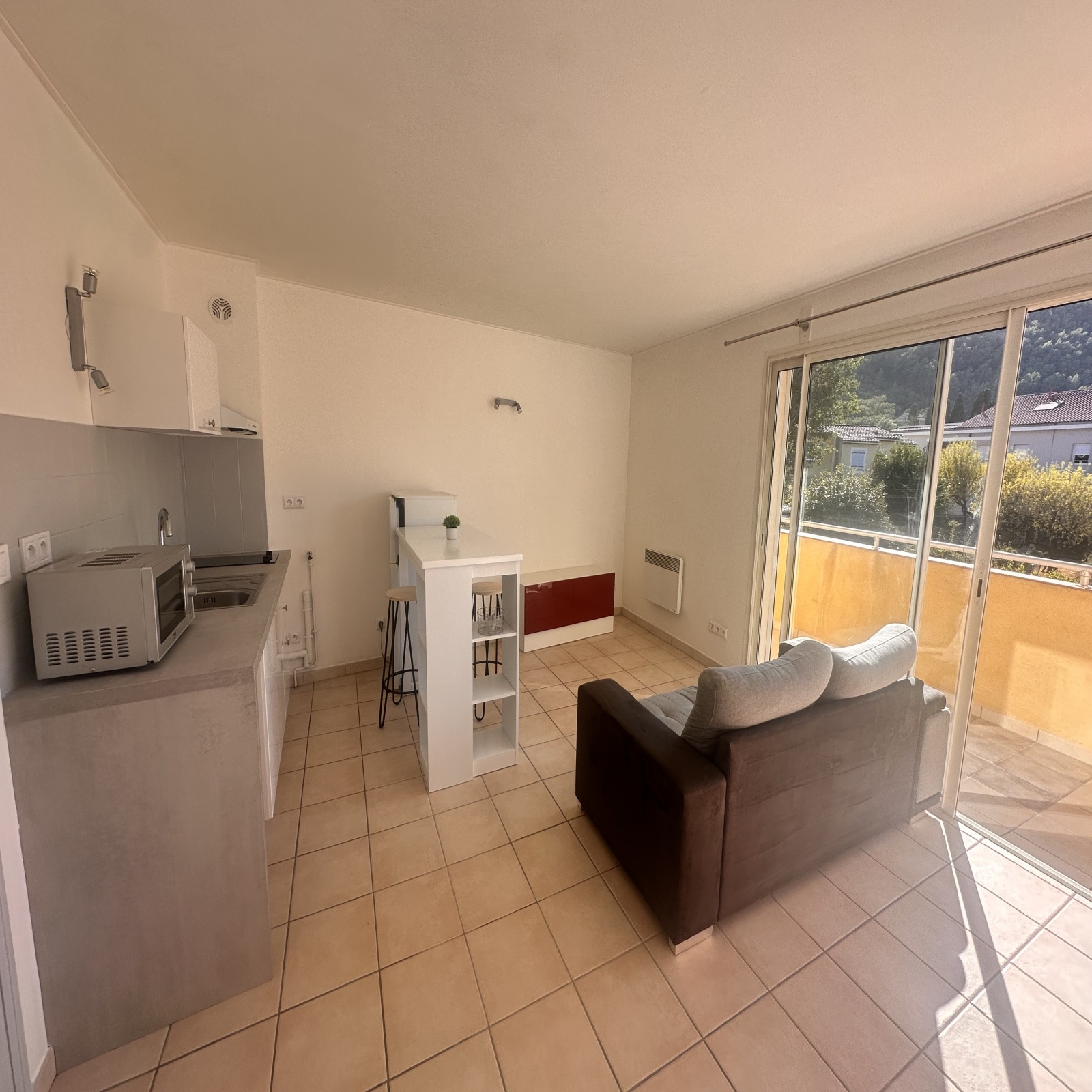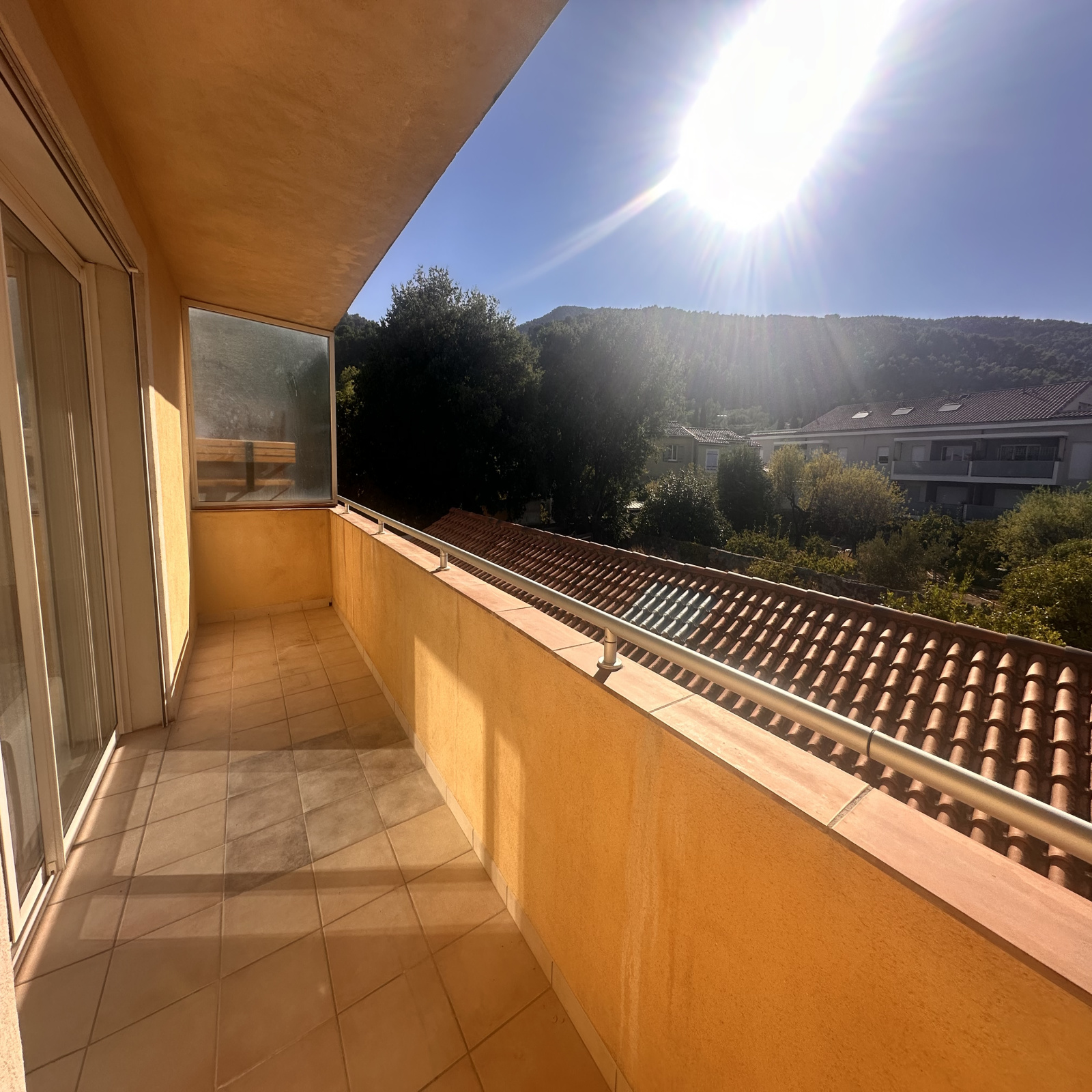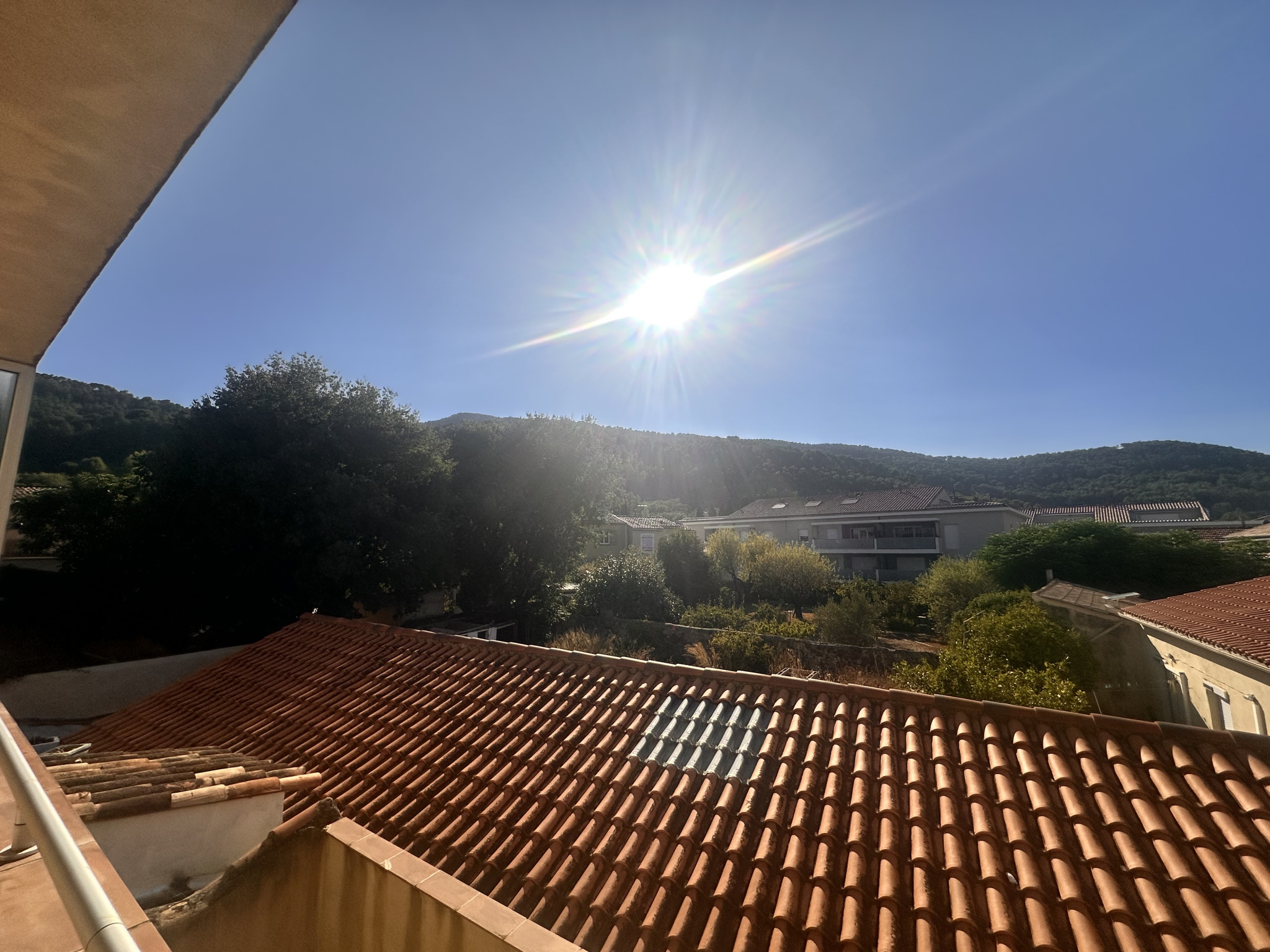 Libre rapidement - Rue de la République à Solliès-Pont - Sympathique appartement T2 meublé de 35.94 m2 situé au 2ème étage (sans ascenseur) comprenant séjour avec cuisine aménagée et équipée donnant sur une sympathique terrasse avec vue dégagée, une chambre et une salle d'eau avec wc