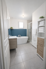 La villa en R+1 est composée : grand hall avec placard/vestiaire et wc, grande pièce à vivre 36.07 m2 avec climatisation et poêle à bois, chambre parentale (douche, vasque) dressing/buanderie le tout pour 22.50 m2 , à l'étage : 2 belles chambres avec placards (13.13 m2 et 11.38 m2) dressing ou bureau de 4.68 m2 av fenêtre, salle de bains (baignoire + douche + vasque) de 5.76 m2, wc indépendant