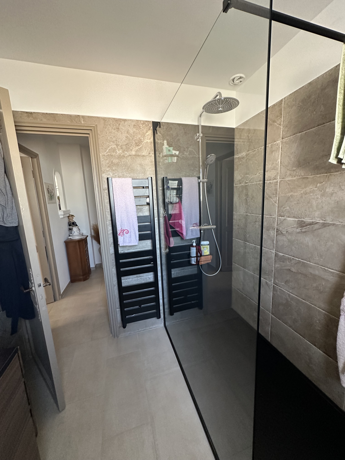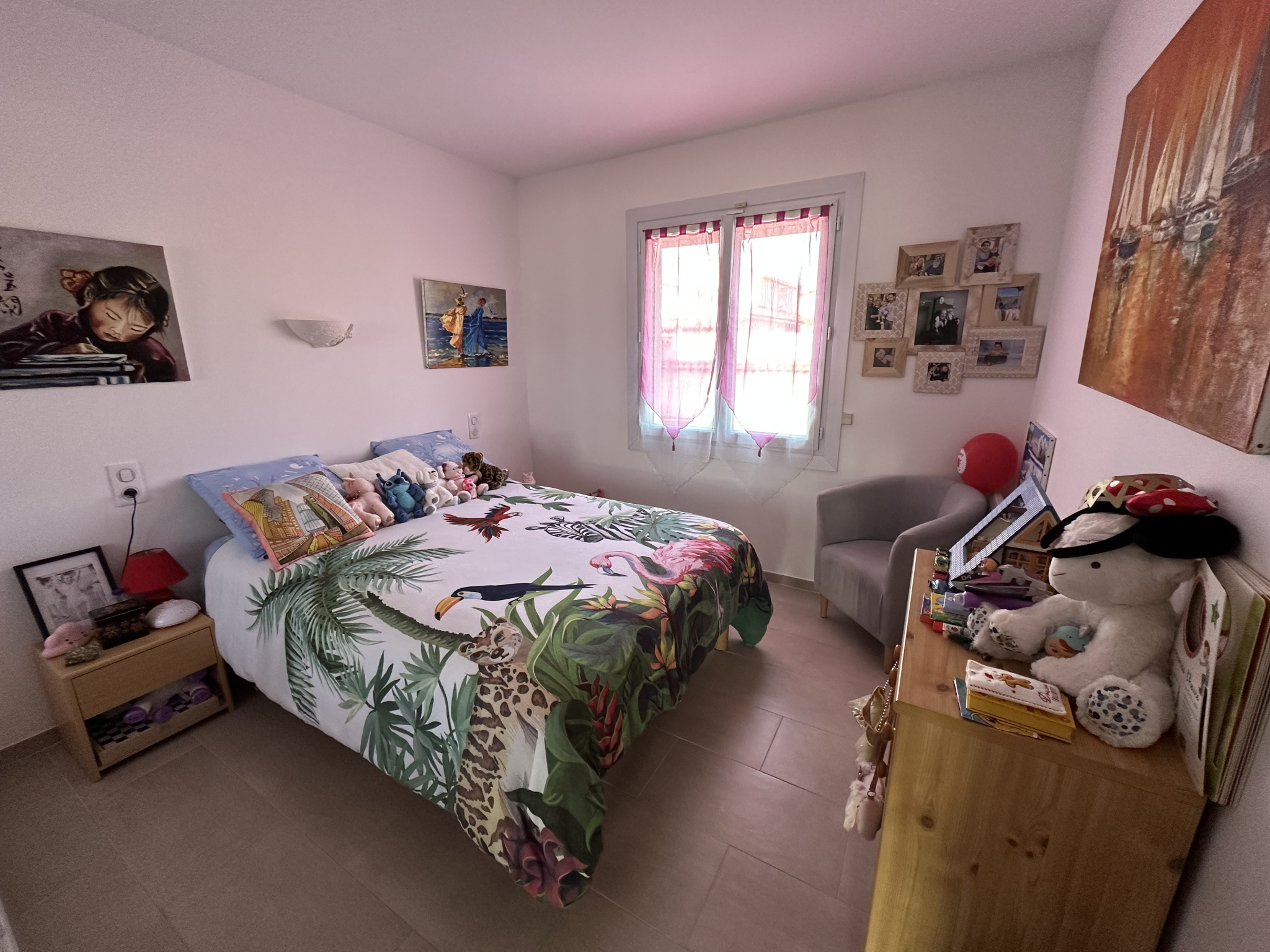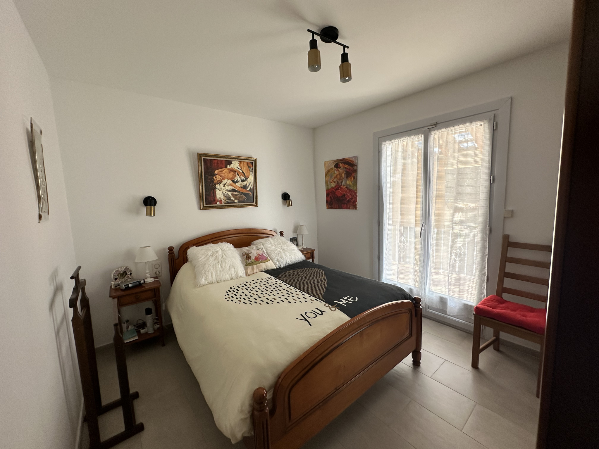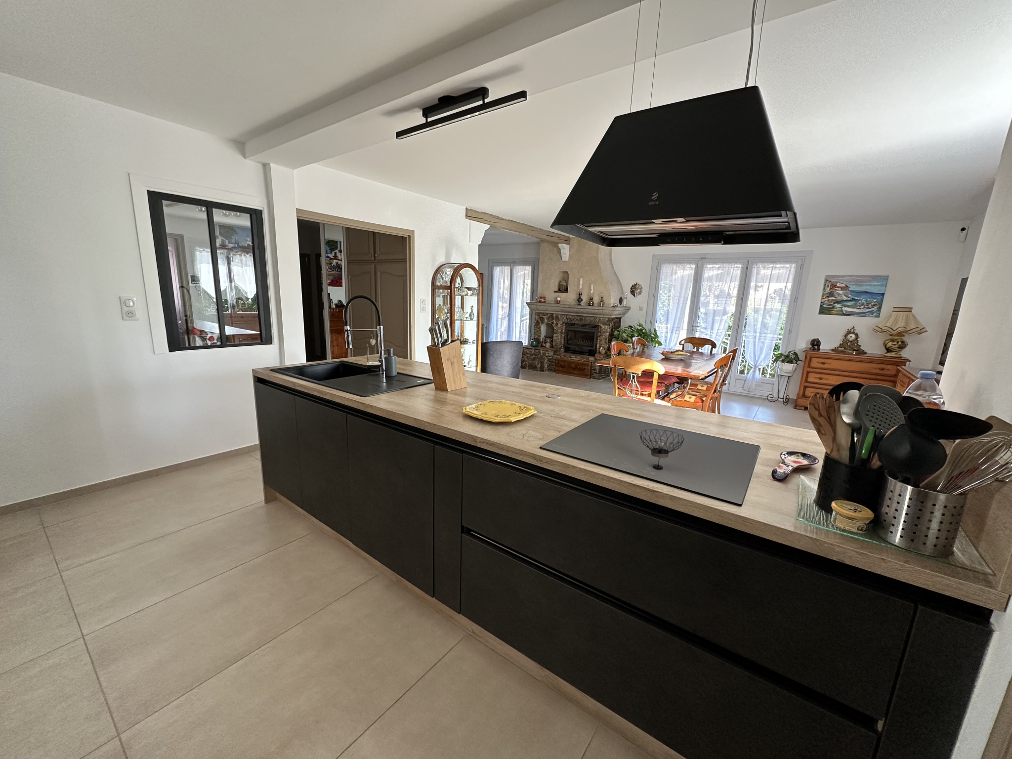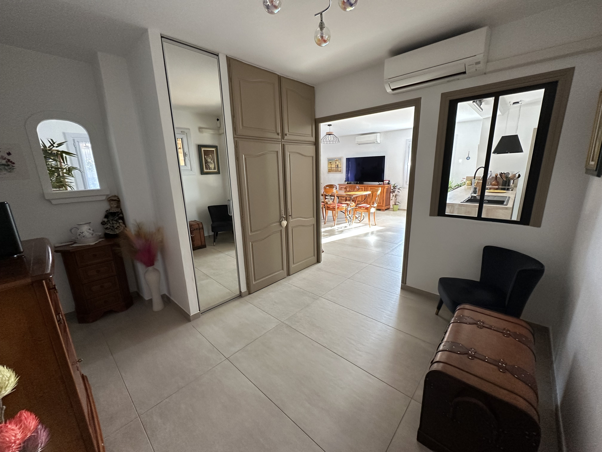 La villa se compose : porche d'entrée avec porte ferronnerie, grand hall d'entrée avec placard vestiaire, grand SEJOUR SALON en L avec très belle cuisine ouverte (meubles et équipements de très belle qualité),arriere cuisine/cellier, 2 belles chambres dont un avec placard, salle d'eau NEUVE (grande douche à l'italienne, 2 vasques avec meubles,